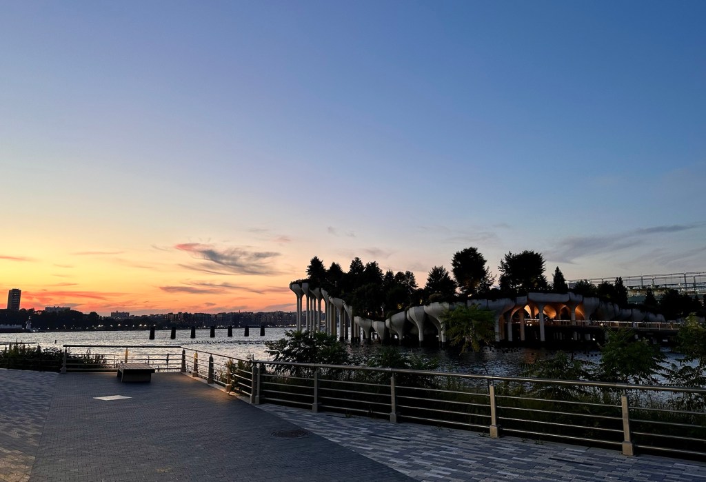 Tucked along the Hudson River, Little Island is one of those NYC spots that look absolutely stunning from afar, especially when its unique design glows in the evening sun.