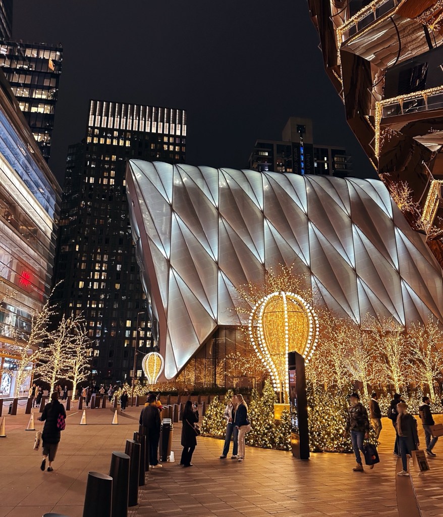 The city is aglow in festive lights, and at Hudson Yards, the holiday decorations beautifully enhance the surrounding architecture, including The Shed’s Bloomberg building.