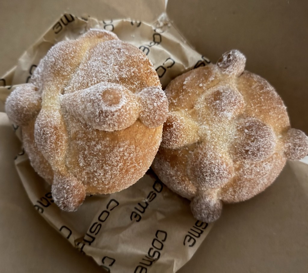 The “bread of the dead” is a sweet, slightly orange-scented bread traditionally baked for Día de los Muertos in Mexico, the Day of the Dead, celebrated November 1 and 2.